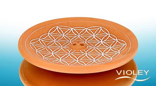 Berk Røgelsesholder i keramik. Den store runde røgelsespindeholder er lavet af ler og har en diameter på ca. 15 cm. Det indgraverede hvide motiv matcher lerets farve. Til indiske, tibetanske og japanske røgelsespinde på grund af de 3 huller af forskellig størrelse.
