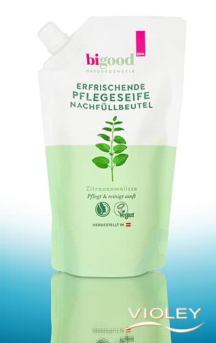 bigood Flydende sæbe citronmelisse i en 300 ml refill-pose. Milde plantebaserede overfladeaktive stoffer renser og plejer naturligt. Forfriskende fugt beskytter huden mod udtørring, mens duften af citronmelisse opfrisker dig.