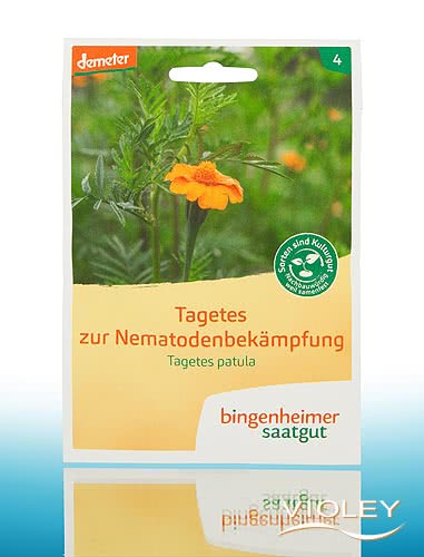 Bingenheimer Saatgut Økologiske frø Tagetes til bekæmpelse af nematoder. Nematoder angriber deres værtsplanters rødder på forskellige måder. Tagetes udskiller en duft via sine rødder, som tiltrækker nematoderne. Så snart de suger på rødderne eller trænger ind i rodsystemet, frigiver den et meget effektivt giftstof, der dræber skadedyret.