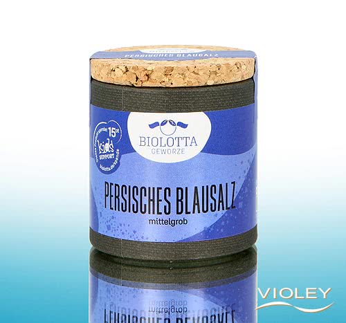 Biolotta Persian Blue Salt. Persisk blåt salt, også kendt som persisk salt, udvindes i Iran. Som små safirer funkler de enkelte krystaller i en ædel blå farve. Den usædvanlige farve skyldes mineralet sylvin, som det indeholder. Den intense smag har en behagelig finish på tungen. Dette blikfang er et fantastisk afslutningssalt i saltkværnen.