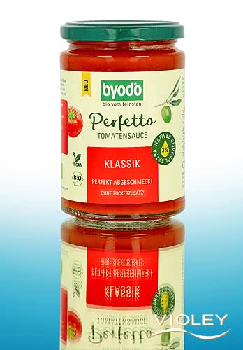 Byodo Organic Perfetto Tomato Sauce Classic. The perfectly balanced all-rounder, either classic or as a fruity-fresh base for pasta, risotto, pizza and lasagne. With 3% extra virgin olive oil and the intense flavour of sun-ripened Italian tomatoes. No added sugar¹.