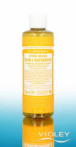 Dr. Bronner's Pure-Castile Liquid Soap 18-in-1 Citrus Orange i størrelsen 240 ml til enkeltstående husholdninger. Basisformlen i den koncentrerede flydende sæbe er en kombination af økologisk kokosolie, økologisk olivenolie og andre olier. Duften af økologisk æterisk olie af citrusappelsin giver sæben et frisk præg.
