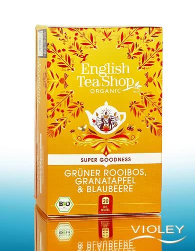 English Tea Shop Økologisk grøn rooibos-, granatæble- og blåbærte. En koffeinfri, ufermenteret grøn rooibos kombineret med kraften fra granatæble og blåbær. Raffineret med andre forskellige frugter findes der næppe en mere frugtagtig måde at slukke tørsten på - fantastisk!