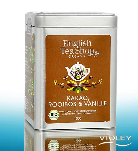 English Tea Shop Økologisk kakao, rooibos og vanilje tedåse i en smart tedåse. Denne lækre blanding glæder simpelthen alle. Den bedste sydafrikanske rooibos kombineret med dejlig vanilje og den bedste kakao. En fin sødme uden tilsat sukker.