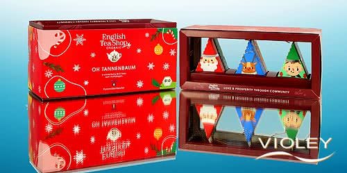 English Tea Shop Økologisk tesamling Oh Christmas Tree. Gavesættet "Oh Christmas tree" indeholder 6 vinterlige julehjælpere fyldt med forskellige økologiske teblandinger. De kærligt designede, trekantede motivæsker kan også bruges som juletræspynt med en løkke. De er også perfekte som gavemærker. Te-gaveæsken er en vidunderlig aromatisk overraskelse til venner, familie, bekendte og kolleger som en lille gave i adventstiden eller til Sankt Nikolaus.