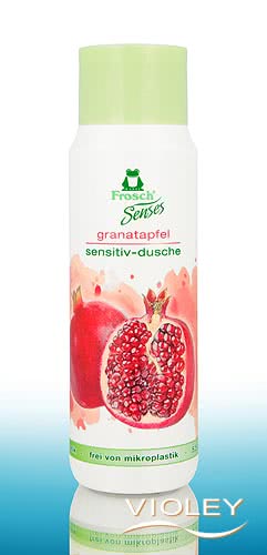 Frosch Senses Pomegranate Sensitive Shower Gel. Den milde formel med granatæbleekstrakt renser huden og efterlader en behagelig, frisk fornemmelse. Den plejende formel er fri for farvestoffer.