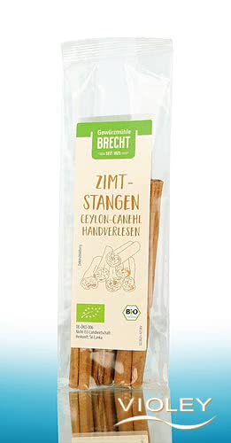 Gewürzmühle Brecht Økologiske kanelstænger Ceylon-Canehl. Kanelstængerne er aromatiske og sød-krydrede og egner sig godt til at raffinere desserter, frugtkompot, gløgg og punch samt til at krydre eksotiske ris-, grøntsags- og kødretter.