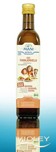 Mani Bläuel Der Familienheld Organic Extra Virgin Olive Oil. Mildly fruity extra virgin olive oil from Greece with selected organic olives. Gently mechanically and cold extracted. Versatile for use in hot and cold dishes.