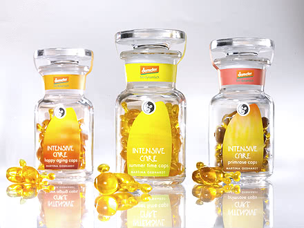 Intensive Care Caps fra Martina Gebhardt er vegetabilske olier i kapsler. Frøolierne af høj kvalitet absorberes hurtigt og efterlader din hud silkeblød og glat. I de veganske kapsler forbliver de værdifulde ingrediensers friskhed intakt. Martina Gebhardt Summertime Caps indeholder et koncentrat af høj kvalitet med olier fra sesamfrø, solsikkefrø, ribs, avocado, mandler og havtornpulp fra Demeter-dyrkning. På grund af det høje indhold af essentielle fedtsyrer beroliger det irriteret og solskadet hud. Desuden skaber det let dækkende koncentrat en jævn teint. Til krævende hud fra 40 år er der Martina Gebhardt Happy Aging Caps med en højkvalitetsblanding af mandelolie, hybenkerneolie, sortkerneolie, vindruekerneolie, hybenekstrakt og kattekloekstrakt, E-vitamin og ægte æteriske olier.