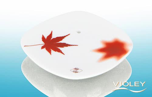 Nippon Kodo Keramisk røgelsesholder Maple Leaf er en hvid keramisk plade med målene 1 cm x 8 cm x 8 cm. Røgelsesholderen er farverigt bemalet med ahornblade. På grund af en lille fordybning er den ideel til at holde røgelsespinde.