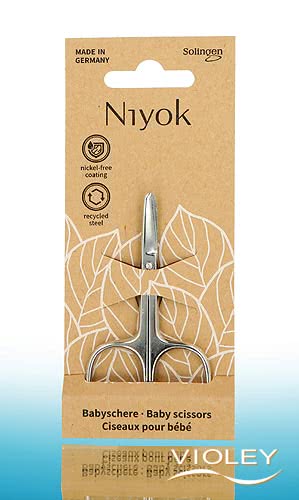 Niyok Baby Neglesaks. Babyneglesaksen har et let buet skær med en afrundet spids, så du sikkert kan klippe dit barns følsomme finger- og tånegle. De ovale grebshuller giver et godt greb til alle fingerstørrelser. Neglesaksen er fremstillet af genanvendt C45-stål med en nikkelfri finish.