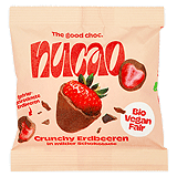 Nucao Økologiske sprøde matcha-jordbær. Frysetørrede økologiske jordbær med et overtræk af fint kakaosmør og økologisk matchapulver. Nyd små chokoladekugler med en frugtagtig midte. Små lækkerier til at dele eller nyde selv.