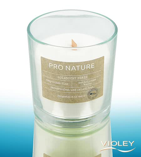 Pro Nature Stearinlys med trævæge, hvid. Nyd knitringen og det ekstraordinære udseende af den dekorative trævæge. Lysestagen er fyldt med stearin, en naturlig voks, som har været brugt til at lave stearinlys siden begyndelsen af det 19. århundrede.