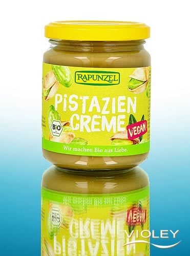 Rapunzel Økologisk pistaciecreme. Denne vidunderligt smeltende veganske creme indeholder 30% lækre økologiske pistacienødder. Den er raffineret med ægte bourbonvanilje og havsalt og giver en lækker smagsoplevelse. Som topping til kager, tærter eller panettone. Pistaciecremen forædler is, budding og yoghurt, men smager også godt alene med en ske eller som smørepålæg.