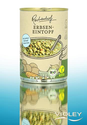 Reichenhof pea stew. Vegan organic stew with tender peas, potatoes, carrots and celery. Traditional and hearty flavour. With a flavourful seasoning.