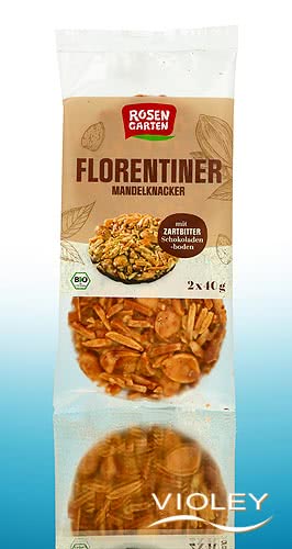 Rosengarten Organic Florentine. Flavoursome roasted almonds meet a delicate hint of orange peel and a fine, tart dark chocolate base. Without any flour and in a practical duo pack. Ideal as an accompaniment to coffee and tea or as a snack between meals.
