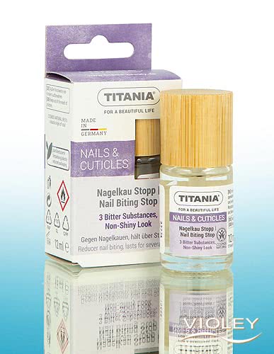 Titania Nail Biting Stop. Neglebidestoppet med denatoniumbenzoat og eukalyptus- og blodappelsinolie har en bitter smag og kan derfor hjælpe med at forhindre ubevidst neglebidning. Formlen indeholder fugtgivende ingredienser, som plejer neglebåndene og understøtter et velplejet udseende af neglene. Nail Bite Stop er farveløs og ikke en neglelak, så den er ikke skinnende.