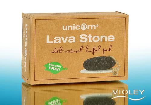 Unicorn Lavasten + loofah-pad. Pimpstenen har en naturligt hård overflade og er derfor ideel til pleje af ru fodområder. En bomuldssnor gør det muligt at hænge pimpstenen til tørre efter brug. Alternativt kan den medfølgende loofah-bakke bruges til at tørre pimpstenen.
