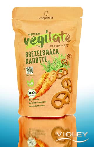 Vegilate Økologisk Pretzel Snack Gulerod. De sprøde økologiske kringlekiks i form af små saltede kringler er raffineret med kakaosmør og gulerødder. En usædvanlig kombination, der leger med kontraster, men stadig skaber et harmonisk smagsindtryk. En snack til alle, der ikke ønsker at vælge mellem sødt og salt.