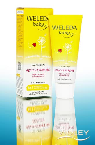 Weleda Baby Calendula Face Cream. Denne fugtgivende creme beskytter det sarte ansigt mod udtørring og absorberes let. Økologisk mandelolie og hudrelateret lanolin beskytter mod tør hud, økologisk morgenfrue beroliger.