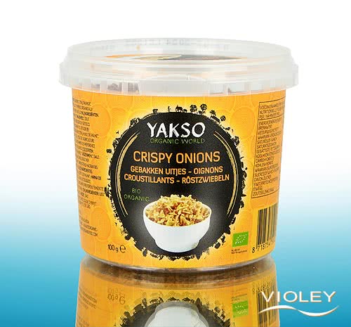 Yakso Økologiske stegte løg. Stegte løg er et velsmagende krydderi, der giver en sprød note til pasta eller stegte ris. De smager også godt i salater, (vegetariske) burgere og supper. Yakso stegte løg er lavet af friske løg, som er pakket ind i dej (lavet af hvedemel) og derefter friturestegt i vegetabilsk olie. Det giver dem et sprødt bid!