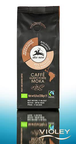 Alce Nero Caffè Gusto Forte Moka. Genießen Sie den vollmundig intensiven Geschmack einer kräftig gerösteten Mischung aus Bio-Arabicabohnen und Bio-Robustabohnen. Klassischer Caffè Moka wird in italienischen Haushalten in einer Caffettiera zubereitet. Bei dem speziellen Verfahren dieser italienischen Mokkakanne wird erst das Wasser erhitzt, bevor es durch das Kaffeepulver dringt. Das Ergebnis ist abhängig von der Kaffeesorte, der Art des Wassers und dem Grad der Erhitzung.