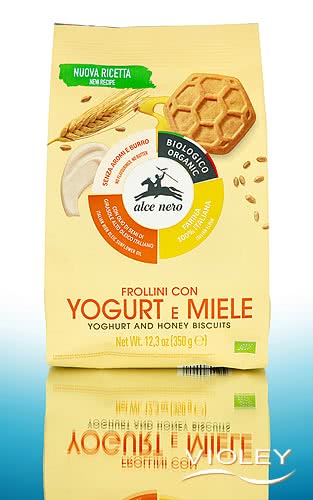 Alce Nero Joghurt Honig Kekse. Knusprige Kekse mit Joghurt und aromatischem Honig, hergestellt aus feinem italienischem Weizenmehl. Die Rezeptur kommt mit wenigen Zutaten aus und verzichtet auf Eier und tierische Fette. Der Joghurt stammt aus italienischer Milch und verleiht den Keksen ihre besondere Note. Ideal für Ihr Frühstück, als Snack zwischendurch oder zu einer guten Tasse Tee oder Kaffee.