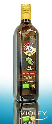 Alce Nero Olivenöl nativ extra Terra di Bari Bitonto g.U.. Apulien ist die Olivenölregion Italiens schlechthin, und aus dem Herzen dieser uralten Ölkultur stammt dieses kaltgepresste Olivenöl aus den Sorten Cima di Bitonto und Coratina aus der Provinz Bari. Grünlich-golden im Glas entfaltet es ein mittleres Fruchtaroma mit Noten von frischen Kräutern und einem angenehmen Hauch von Bitterkeit und Schärfe im Abgang. Die Oliven werden zwischen Oktober und Januar von Hand geerntet und unmittelbar danach kaltgepresst.