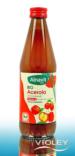 Alnavit Bio Acerola. Der vegane Bio Acerola Direktsaft besteht zu 100% aus Acerolakirschen. Er enthält nur die natürliche Süße der Kirschen (enthält von Natur aus Zucker). Der Saft schmeckt mit seiner sämigen Konsistenz und mild säuerlichen Note am besten verdünnt mit Wasser oder anderen Fruchtsäften – und besonders gut in Joghurt oder Quark.