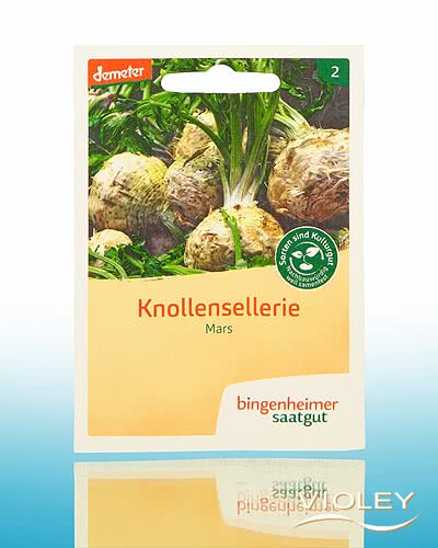 Bingenheimer Saatgut Knollensellerie Mars. Großwüchsiger, glatter Sellerie mit weißem Fleisch. Das Laub ist aufrecht, dunkelgrün und robust. Die Samen sollten nicht bedeckt oder nur leicht bedeckt werden da die Knollensellerie ein Lichtkeimer ist.