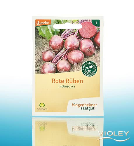 Bingenheimer Saatgut Rote Rüben Robuschka. Sehr gut lagerfähige, dunkelrot durchgefärbte Rote Bete. Diese Selektion zeichnet sich durch einen besonders angenehmen, fruchtig-süßen Geschmack aus. Das Beet sollte nicht frisch gedüngt und die Erde gut gelockert sein. Nach dem Auflaufen müssen die Rote Bete-Pflanzen vereinzelt werden.