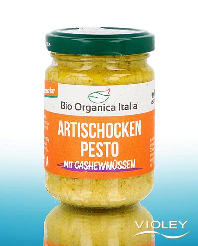 Bio Organica Italia Artischocken Pesto mit Cashewnüssen. Mild-herbe Artischocke, nussige Cashews, extra natives Olivenöl und ausgewählte Gewürze - mehr braucht es für dieses Pesto nicht. Ein aromatisches Erlebnis zusammen mit Pasta, als Brotaufstrich, oder als Würze in Soßen und Suppen.