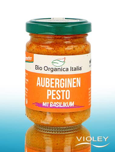 Bio Organica Italia Auberginen Pesto. Aromatisches Pesto mit Auberginen, sonnengetrockneten Tomaten, Knoblauch, Zwiebel und Basilikum. Als Beilage zu Pasta und Reisgerichten, zum Verfeinern von Pizza oder klassisch als Brotaufstrich.