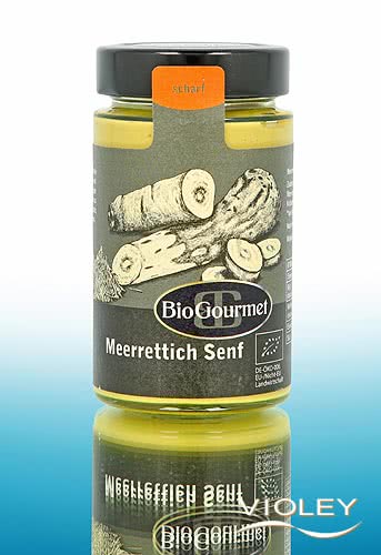 BioGourmet Meerrettich Senf. In diesem Senf kommt die natürliche Würze des Meerrettichs mit den scharfen Senfölen zusammen. Durch seine ausgeprägte Meerrettichnote ist dieser Senf ideal geeignet als feurige Beigabe zu herzhaften Gerichten wie Roastbeef oder Tafelspitz, sowie zur Verfeinerung von Dressings und Saucen.