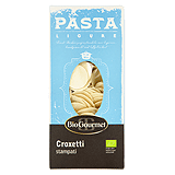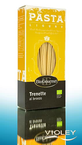 BioGourmet Trenette. Die BioGourmet Trenette al bronzo sind ein Stück ligurischer Esskultur. Gefertigt werden die Trenette aus Hartweizengrieß und reinem Quellwasser, durch Bronzematrizen gepresst und anschließend behutsam getrocknet. Diese traditionelle Verarbeitung unterstreicht das herrlich frische Aroma und sorgt für eine raue Oberfläche, die Saucen optimal aufnimmt. So sind Trenette zwar verwandt mit der Linguine, jedoch sind sie etwas flacher und bekommen bei der Trocknung das eigenständige u-förmige Merkmal - ein Zeichen echter Handwerksqualität und Pasta-Leidenschaft. Man serviert sie rund um Genua mit einem Pesto Genovese, aber auch rustikal mit grünen Bohnen und Kartoffeln. Sie passen aber ebenso hervorragend zu Meeresfrüchten oder Gemüse-Saucen.