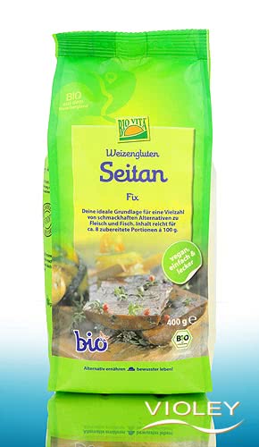 Biovita Weizengluten Seitan Fix. Zur Herstellung von Seitan und als Backzutat. Grundlage für eine Vielzahl von Alternativen zu Fleisch. Der Inhalt reicht für ca. 8 Portionen á 100 g.