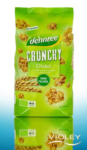 dennree Crunchy Dinkel Müsli. Dieses geröstete Bio-Dinkelmüsli wird aus Dinkelvollkornflocken schonend hergestellt und mit Reissirup verfeinert. Am besten schmeckt es mit Milch, Joghurt oder als knusprige Zutat für's Müsli. Es bietet aber auch pur leckeren Knabberspaß für Groß und Klein. Genießen Sie den knusprig-kernigen Dinkel-Geschmack.