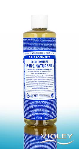 Dr. Bronner's 18-in-1 Naturseife Pfefferminze. Die konzentrierte Flüssigseife pflegt die Haut mit einer Kombination verschiedener Bio-Öle wie Kokosöl, Olivenöl und Jojobaöl. Ätherisches Bio-Pfefferminzöl sorgt für eine erfrischende Kühle und ein angenehmes Prickeln auf der Haut.
