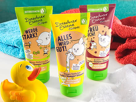 Das Dresdner Essenz Dreckspatz Schaumbad „Träum Gut“ mit beruhigendem Lavendelduft bereitet das Kind sanft für die Nacht vor. Zarte Kinderhaut wird mit Bio-Sesamöl und Weizenprotein bestens gepflegt. Dreckspatz „Hab Mut“ ist ein wunderbar nach Mandarinen duftendes Schaumbad für Kinder. Das fruchtig-frische Aroma macht es zum Favoriten aller furchtlosen Badezimmerpiraten. Wenn das Wetter draußen grau und regnerisch ist und die kleinen Abenteurer durchnässt und schniefend nach Hause kommen, dann ist ein Dreckspatz Pulverbad „Bleib Gesund“ genau das Richtige. Es duftet angenehm nach Thymian, Fenchel und Pfefferminz und sorgt zusammen mit dem warmen Wasser schnell wieder für ein kuschelwarmes Gefühl. Und wenn einmal keine Zeit zum Baden ist? Dann machen die Dreckspatz Duschgele von Dresdner Essenz das Duschen unter der Brause zum Vergnügen. Ob mit frischem Melonen-Pfefferminz-Duft, dem fruchtigen Aroma von Orange und Vanille oder herrlich süßem Brombeerduft, der Dreckspatz fühlt sich auch unter der Dusche pudelwohl. Ihre Kinder werden begeistert sein!