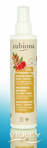 Eubiona Hair Repair Sprüh-Haarpflege Arganöl Granatapfel. Intensivpflege für strapaziertes oder gefärbtes Haar. Wussten Sie, dass Arganöl als marokkanisches Gold gilt – und Kopfhaut sowie Haar mit Feuchtigkeit verwöhnt? Diese Haarpflege mit Arganöl und Granatapfelsamenöl nährt, schützt und repariert sehr trockenes und geschädigtes Haar, ohne es zu beschweren.