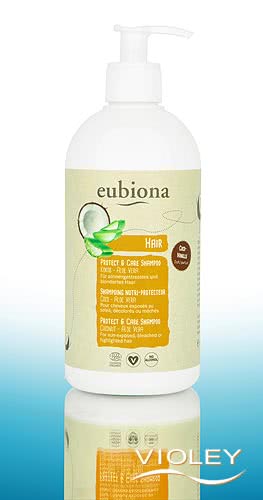 Eubiona Protect & Care Shampoo Kokos Aloe Vera im familienfreundlichen 500-ml-Pumpspender. Intensive Haarpflege mit bewährten Essenzen aus der Natur und sanfte Reinigung mit milden Tensiden aus nachwachsenden Rohstoffen. Kokosöl, Aloe Vera und Weizenprotein nähren, reparieren, spenden Feuchtigkeit und schützen so sonnengestresstes und blondiertes Haar.
