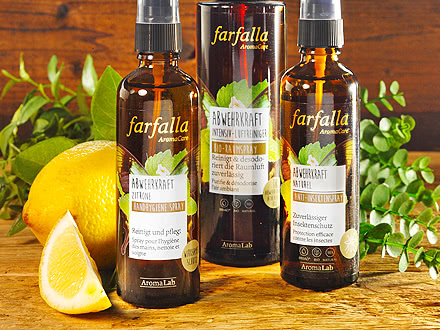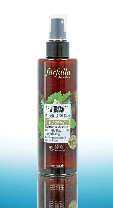 Das Abwehrkraft Anti-Insektenspray und die Duftmischung Plagegeister Stopp von Farfalla halten lästige Störenfriede ganz natürlich auf Distanz ohne die Chemiekeule zu schwingen. Genießen Sie lauschige, ungestörte Abende und ruhige Nächte dank einer Duftmischung von Citronella, Lavendel und Rosengeranie. Aber nicht nur Insekten, auch Menschen meiden unangenehme Gerüche. Dabei lassen sich diese problemlos ändern. Der Duft ätherischer Öle verändert auch die Raumluft und schafft eine angenehme Raumatmosphäre. Der Farfalla Intensiv-Luftreiniger mit einer einzigartigen Formel aus 18 bewährten ätherischen Ölen ist als Bio-Raumspray und als Duftmischung lieferbar. Der waldig-frische Duft desodoriert die Raumluft und unterstützt das Wohlbefinden. Für die zuverlässige Handreinigung ohne Wasser, Seife oder Waschen hat Farfalla zudem das Abwehrkraft Handhygiene Spray mit Alkohol und ätherischen Ölen entwickelt. Hautberuhigendes Rosenhydrolat pflegt beanspruchte Hände. Teebaum, Zitrone und Pfefferminz wirken antimikrobiell. Das Abwehrkraft Bio-Maskenspray erhöht den Tragekomfort der täglichen Schutzmaske mit dem angenehmen Duft natürlicher ätherischer Öle von Zitrone, Orange, Pfefferminze. Durch die Beduftung der Maske sind die ätherischen Öle wahrnehmbar, gelangen in die Atemwege und verbessern das Gefühl beim Tragen der Mund-Nasenschutzmaske. Mit der Serie Farfalla Abwehrkraft nutzen Sie die vitalisierenden Eigenschaften ätherischer Öle für Ihr tägliches Wohlbefinden.