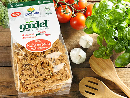 Für Vegetarier und Veganer spielen eiweißreiche Hülsenfrüchte eine wichtige Rolle. Zwar sind alle Pflanzen Proteinlieferanten, aber Saaten, Nüsse und Hülsenfrüchte enthalten besonders viel Eiweiß. Hülsenfrüchte enthalten zudem relativ wenig Fett und machen satt. Darum sind Bohnen, Erbsen und Linsen auch eine interessante Option, um das eigene Gewicht unter Kontrolle zu halten. Hülsenfrüchte werden seit Jahrtausenden auf allen Kontinenten angebaut. Während im fernen Osten Sojabohnen dominierten, wurden in Europa vor allem Erbsen und Linsen angebaut. In der mediterranen Küche sind sie bis heute unverzichtbar. Man kann aus Hülsenfrüchten aber noch viel mehr machen, als nur Beilagen und Salat. Zum Beispiel Nudeln. Die Besonderheit der Goodel von Govinda liegt in der einfallsreichen Auswahl der Zutaten und der speziellen Art der Trocknung. Für die Nudeln werden schmackhafte Hülsenfrüchte mit nährstoffreichen Samen oder nussigem Buchweizen kombiniert. Industriell hergestellte Nudeln werden in der Regel bei Temperaturen von über 100°C getrocknet. Govinda Goodel hingegen trocknen schonend bei maximal 42°C. Darüber hinaus wird bei der Herstellung kein Speisesalz verwendet. Govinda Goodel Pasta gibt es in verschiedenen leckeren Sorten. Ob Kichererbsen, Linsen, Buchweizen, Vollkornreis, Mais und Quinoa oder gekeimter Dinkel – Govinda Goodel überzeugen mit edlem Geschmack und kurzen Zubereitungszeiten.