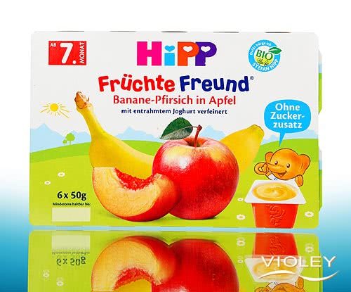 Hipp Früchte-Freund Banane-Pfirsich in Apfel, mit entrahmtem Joghurt verfeinert, wärmebehandelt. Das fruchtige Trio aus Äpfeln, Bananen und Pfirsichen wird durch Zugabe von entrahmtem Joghurt zum cremigen Genuss. Ohne Zusatz von Zucker (Zutaten enthalten von Natur aus Zucker). So wird's gegessen: Ab dem 7. Monat als kleine Zwischenmahlzeit oder Nachtisch.