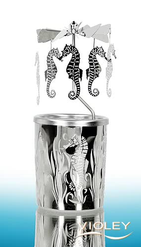 Der beigelegte Propeller wird seitlich in das Glas gesteckt und mit fünf silbernen Seepferdchen-Metalldekor-Anhängern bestückt. Durch die Hitze des Teelichtes dreht sich der Propeller wie von Zauberhand und erschafft ein beeindruckendes Schattenspiel. Ein echter Hingucker!