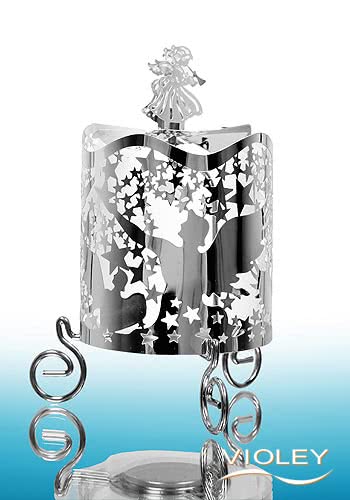 Der beigelegte Propeller wird über dem Teelicht auf seiner Halterung platziert. Durch die Hitze des Teelichtes dreht sich der Propeller wie von Zauberhand und erschafft ein beeindruckendes Schattenspiel. Oben auf dem Propeller tanzen dazu zwei weitere Engel im Lichterschein. Ein echter Hingucker!