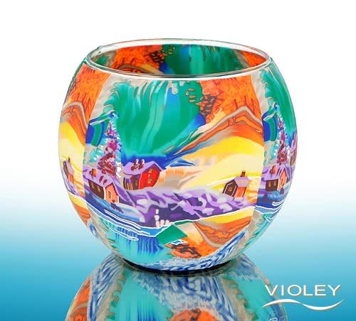 Farbenfrohes Teelichtglas mit nordischem Dorf und Polarlichtern