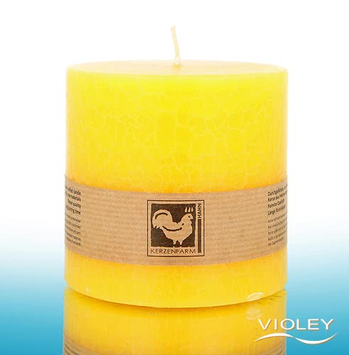 Kerzenfarm Hahn Stumpenkerze Gelb Cracklee 90 x 100 mm. Die schöne gelbe Stumpenkerze mit der marmorartigen Oberfläche sorgt für angenehmes Licht und eine stimmungsvolle Atmosphäre. Die hochwertigen Paraffinwachse verbrennen rückstandsfrei. Kerzenfarm Hahn verwendet nur ausgesuchte Dochte aus 100% Baumwolle.