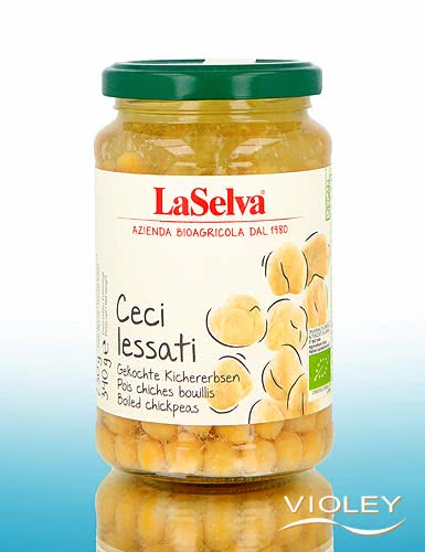 La Selva Ceci lessati. Die gekochten Kichererbsen im Glas sind in Salzlake eingelegt . Die Hülsenfrüchte sind vor allem in der vegetarischen und veganen Küche vertreten und schmecken als Falafel zubereitet, in Currys, Salaten oder deftigem Eintopf.