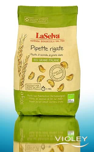 LaSelva Pipette Rigate. Pipette Rigate sind kleine, rund gebogene, geriffelte Röhrennudeln aus Hartweizengrieß. Die Schneckenhäusern ähnelnden Nudeln nehmen wegen ihrer Form und ihrer Oberfläche cremige und stückige Saucen gut auf, passen aber auch gut zu Salat.